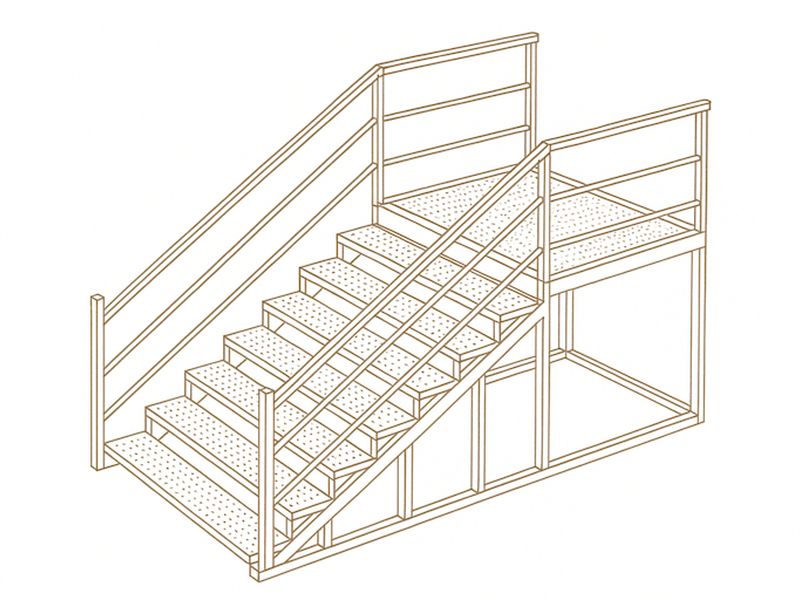 Надежная лестничная конструкция для уличного использования. Каркас изготовлен из профильной трубы 40х20 и 20х20. Ступени выполнены из материала — рифленый лист толщиной 4 мм (по желанию заказчика возможно изменение покрытия). Лестница устойчива к погодным воздействиям. Конструкция с площадкой. Покраска осуществляется полимерной порошковой краской с использованием цинкосодержащего грунта, что значительно увеличивает срок эксплуатации изделия.